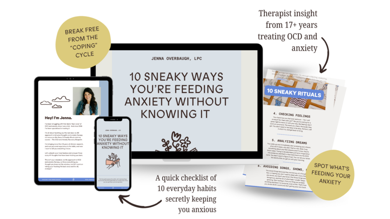 Hi, I’m Jenna! I’ve been struggling with that damn "fear voice" of OCD and anxiety since I was a kid, and since 2008 I’ve been specialized in treating it. I’m all about teaching you the real deal, no-BS approach to intrusive thoughts and anxiety therapy via resources like this workshop and my course — The OCD and Anxiety Recovery Blueprint.